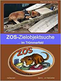 Erhältlich im Baumann-Mühle-Verlag, ca. 200 SeitenIna Baumann, 29,90 € zzgl. Versandkosten ZOS-Zielobjektsuche, ...im Trümmerfeld, ist der zweite Band der Buchreihe zur Zielobjektsuche. Die Autorin Ina Baumann gibt als renommierte und kompetente Spezialistin einen tiefgründigen Einblick in die faszinierende Welt der ZOS-Trümmersuche. Dabei erfasst sie inhaltlich alle wesentlichen Voraussetzungen zu einer erfolgreichen Sucharbeit für alle ZOS-Interessierten, die entweder gerade mit der Trümmersuche beginnen oder die Trümmersuche einfach nur verbessern wollen. Zur Zielgruppe des Buches zählt dabei nicht nur das sportlich ambitionierte ZOS-Team in der Vorbereitung von Wettkämpfen. Auch ZOS-Teams, die dieses Training als reine Beschäftigungsvariante bevorzugen, erhalten jede Menge Tipps und Anregungen. Dabei wird eine Reihe von unterschiedlichen Schwerpunkten erläutert, wie unter anderem die Faszination der Geruchsentstehung und -verteilung, strategisch wichtige Aufbauregeln zum Trümmerfeld, die verschiedenen Führtechniken, Förderung von Suchintensität und Suchkondition, Optimierung der Anzeigeleistung und auch der positive Aspekt der Trümmersuche aus physiotherapeutischer und verhaltenstherapeutischer Sicht.